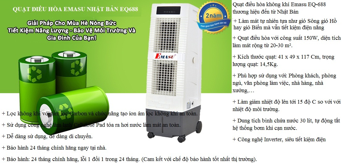 Quạt điều hòa không khí Emasu EQ688 thương hiệu đến từ Nhật Bản, nhập khẩu 100% nguyên chiếc từ Nhật Bản, Sản phẩm duy nhất với chính sách bảo hành độc nhất vô nhị, bảo hành đổi mới tới 24 tháng.